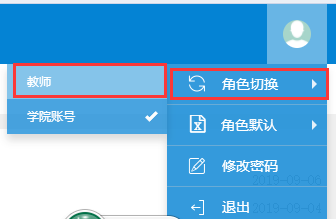 2、登录新综合教务系统后,点击页面右上角的人物头像,先切换教师角色,操作如下图所示。